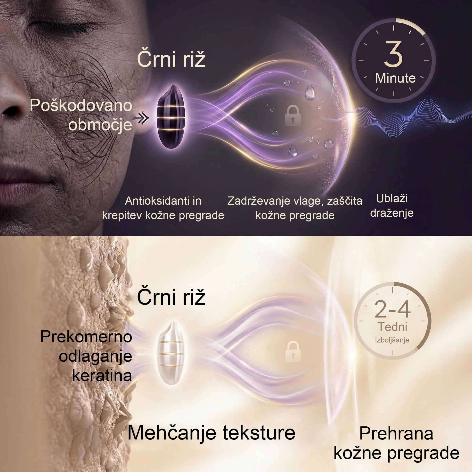 Skupaj črni in beli riž pomirjata ob stiku, uravnavata nenormalno rast celic in krepita naravno obrambno sposobnost kože, naslavljata vzrok bradavic in težav s teksturo brez agresivnih kemikalij, zaradi česar je varno za vsakodnevno uporabo na vseh tipih kože.